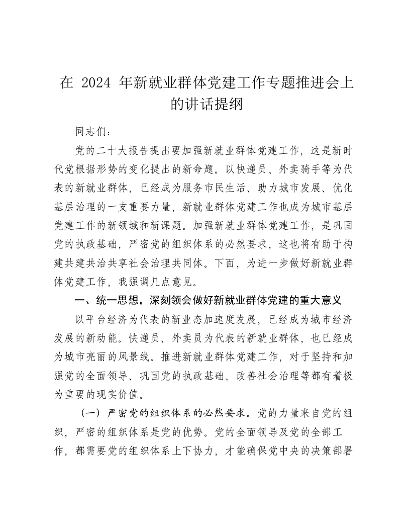 在2024年新就业群体党建工作专题推进会上的讲话提纲