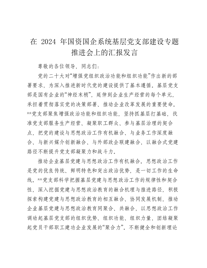 首页讲课讲稿在2024年国资国企系统基层党支部建设专题推进会上的汇报发言