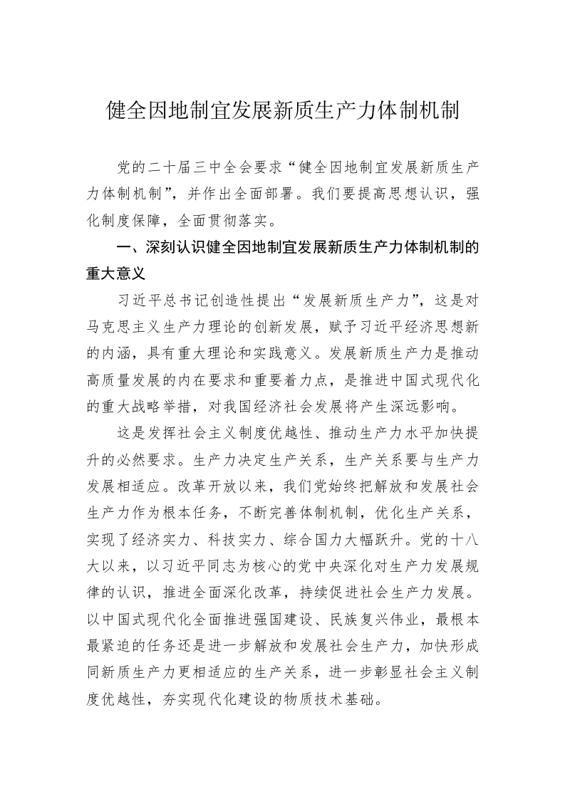 首页讲课讲稿健全因地制宜发展新质生产力体制机制