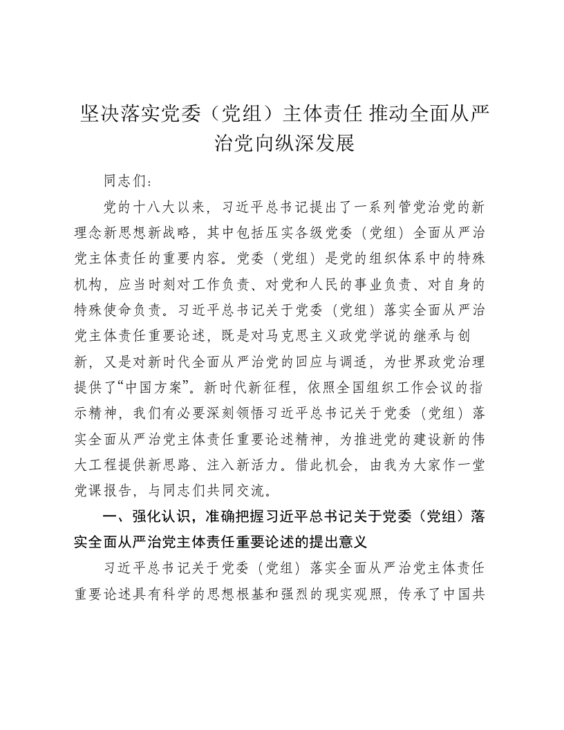 党课:坚决落实党委党组主体责任 推动全面从严治党向纵深发展