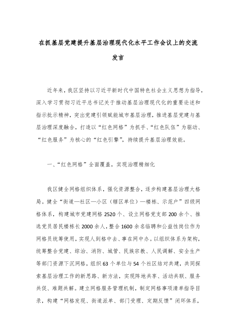 在抓基层党建提升基层治理现代化水平工作会议上的交流发言