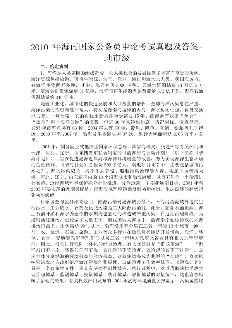 首页公考遴选2010年海南国家公务员申论考试真题及答案-地市级
