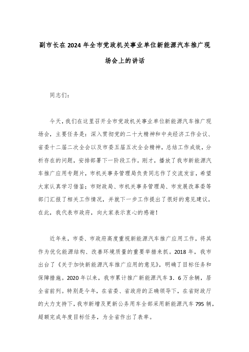 副市长在2024年全市党政机关事业单位新能源汽车推广现场会上的讲话