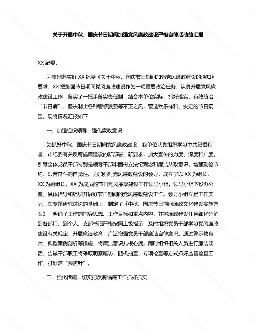 首页材料汇编关于开展中秋、国庆节日期间加强党风廉政建设严格自律活动的汇报