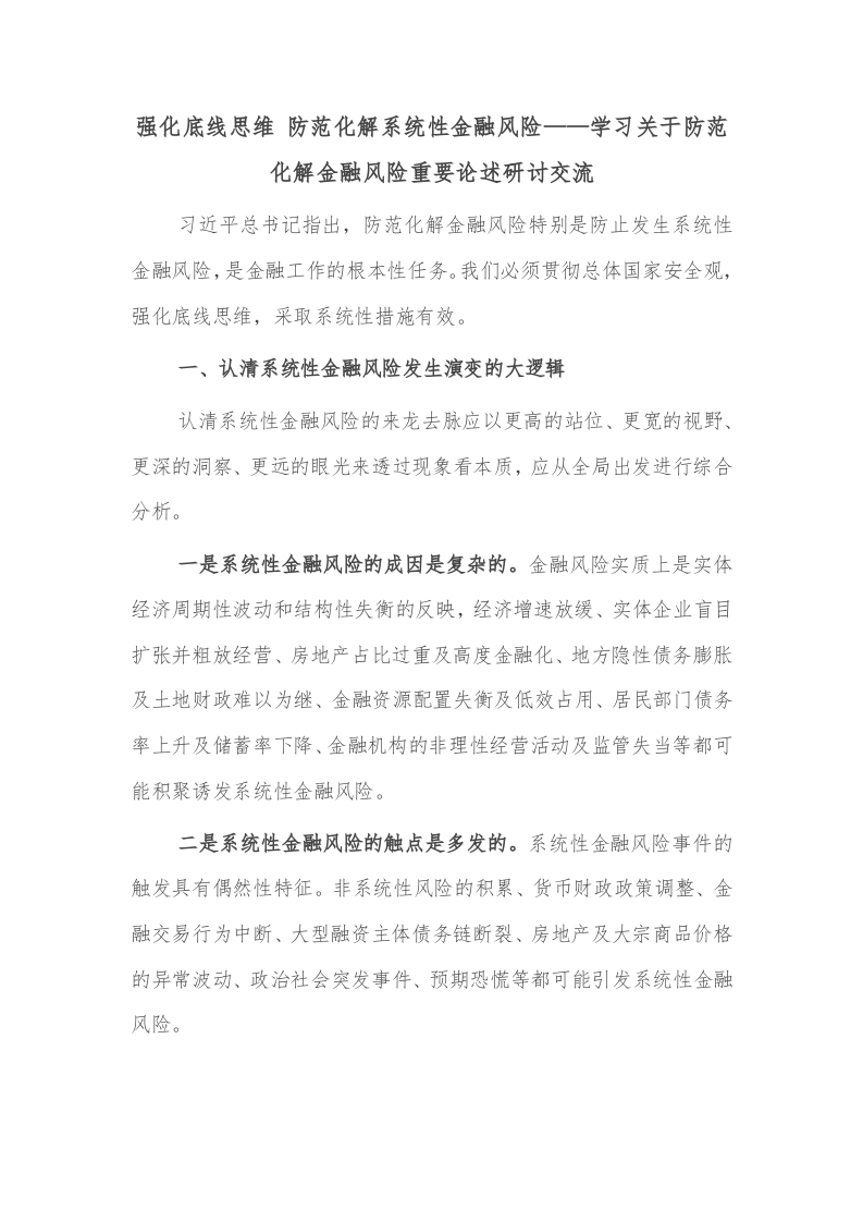 首页讲课讲稿强化底线思维 防范化解系统性金融风险——学习关于防范化解金融风险重要论述研讨交流