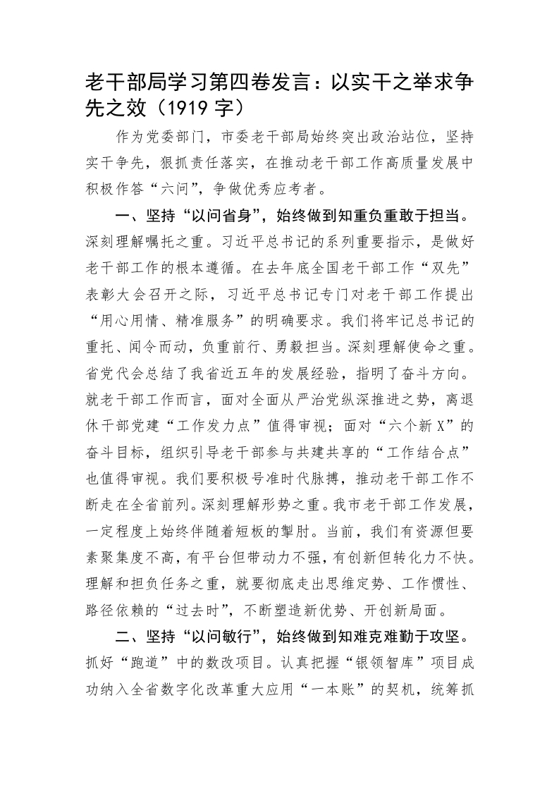 首页精选范文老干部局学习第四卷发言:以实干之举求争先之效