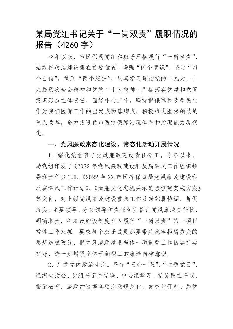 首页精选范文某局党组书记关于“一岗双责”履职情况的报告