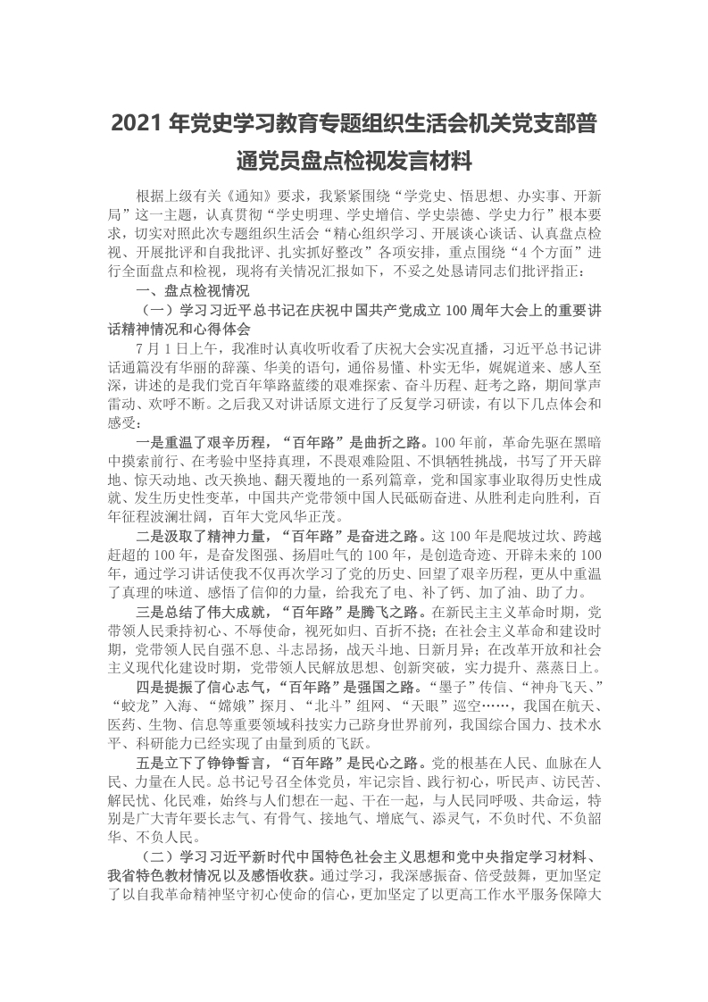 2021年党史学习教育专题组织生活会机关党支部普通党员盘点检视发言材料