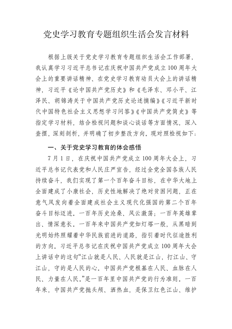 党史学习教育专题组织生活会发言材料 (2)