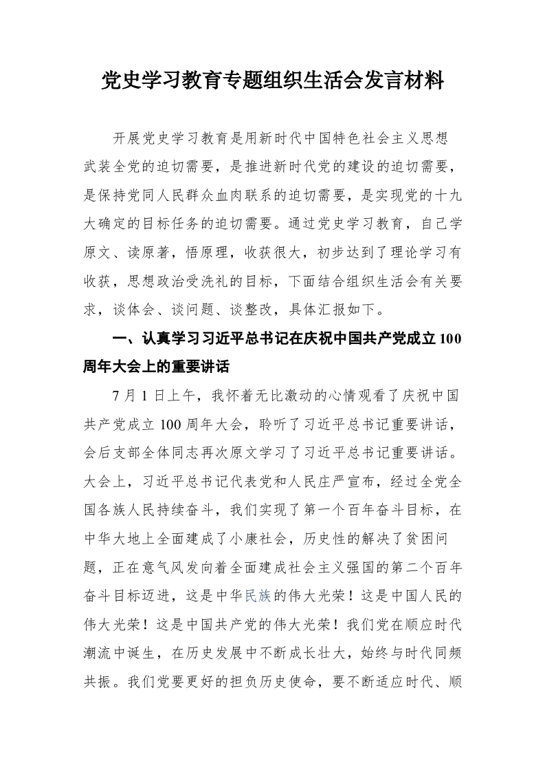 首页讲课讲稿党史学习教育专题组织生活会发言材料