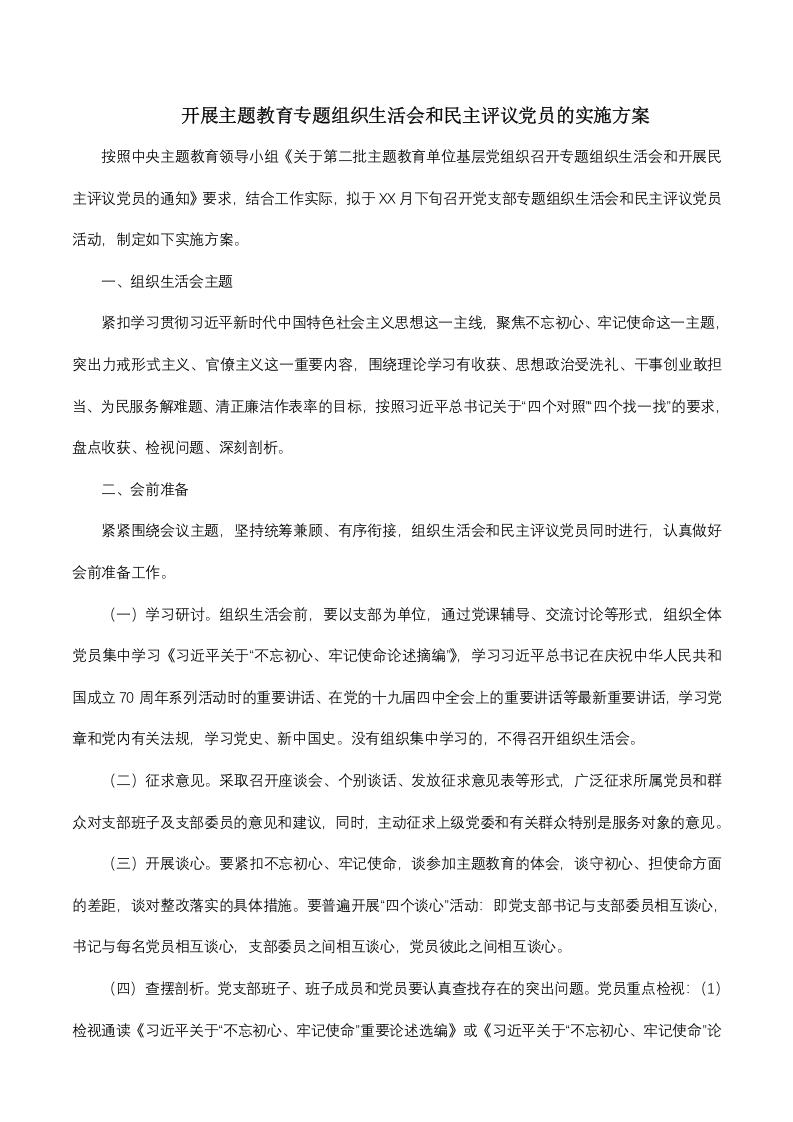 - X乡机关支部关于第二批主题教育召开专题组织生活会和开展民主评议党员的实施方案