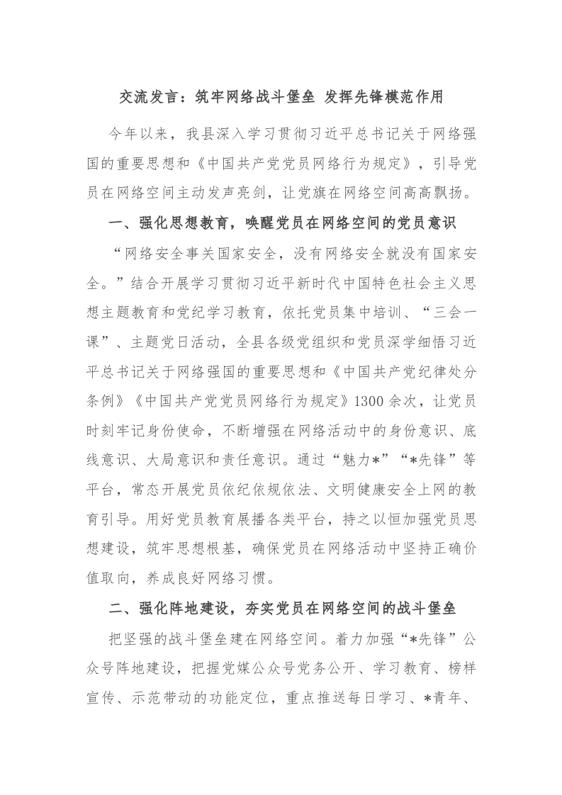 交流发言:筑牢网络战斗堡垒 发挥先锋模范作用
