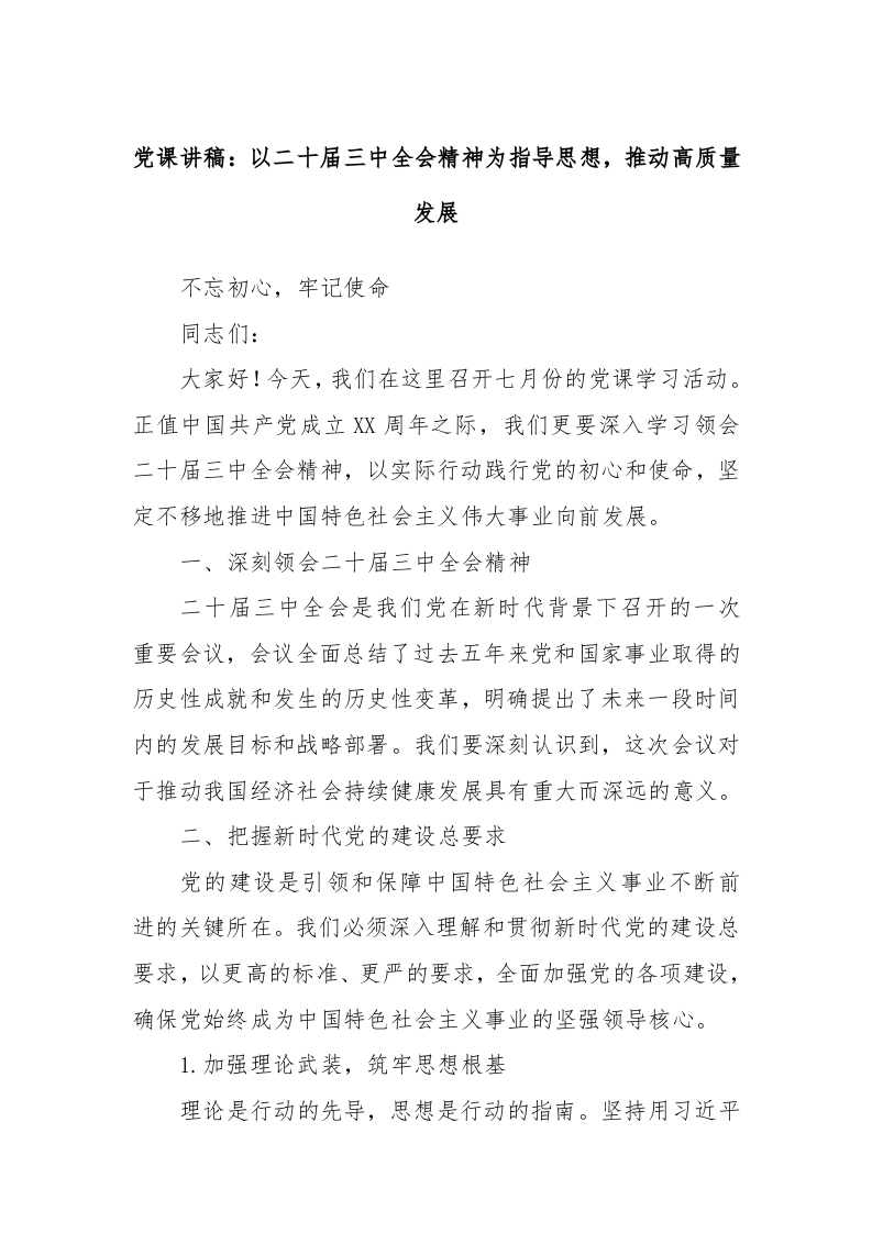 - 党课讲稿:以二十届三中全会精神为指导思想,推动高质量发展