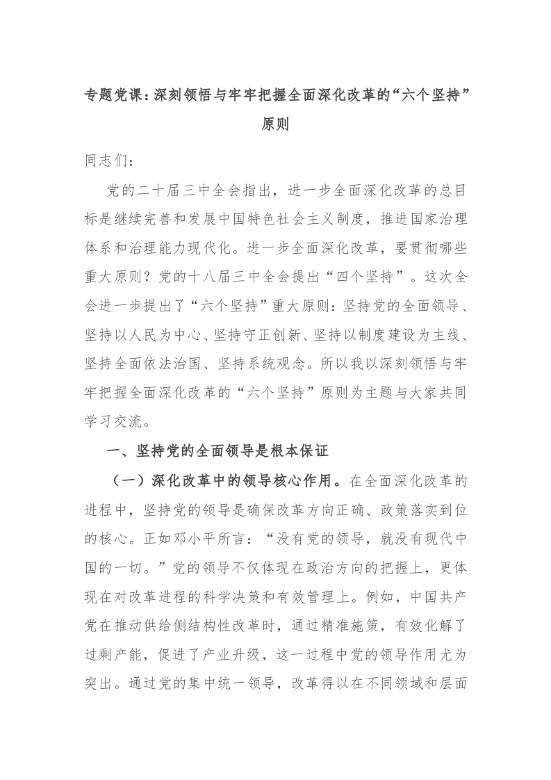 - 党课讲稿:全面把握进一步全面深化改革的“六个坚持”重大原则
