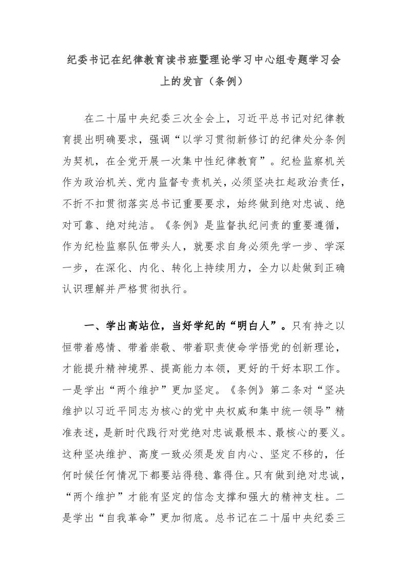 - 纪委书记在纪律教育读书班暨理论学习中心组专题学习会上的发言条例
