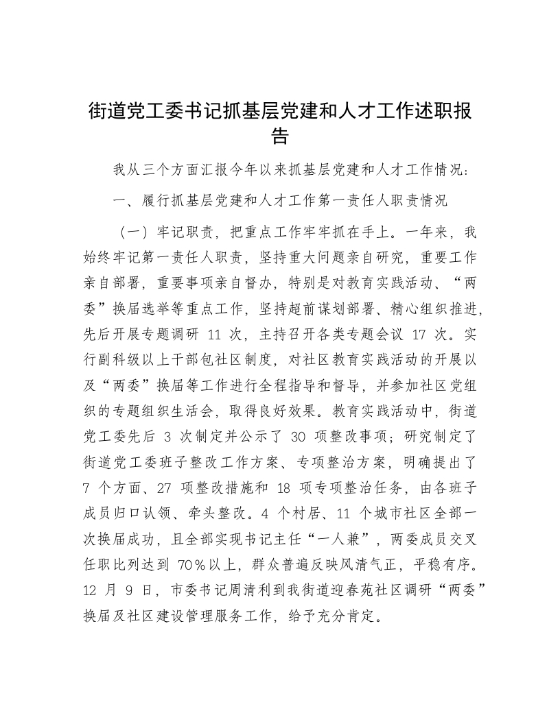 - 关于XX街道党工委书记抓基层党建和人才工作述职报告