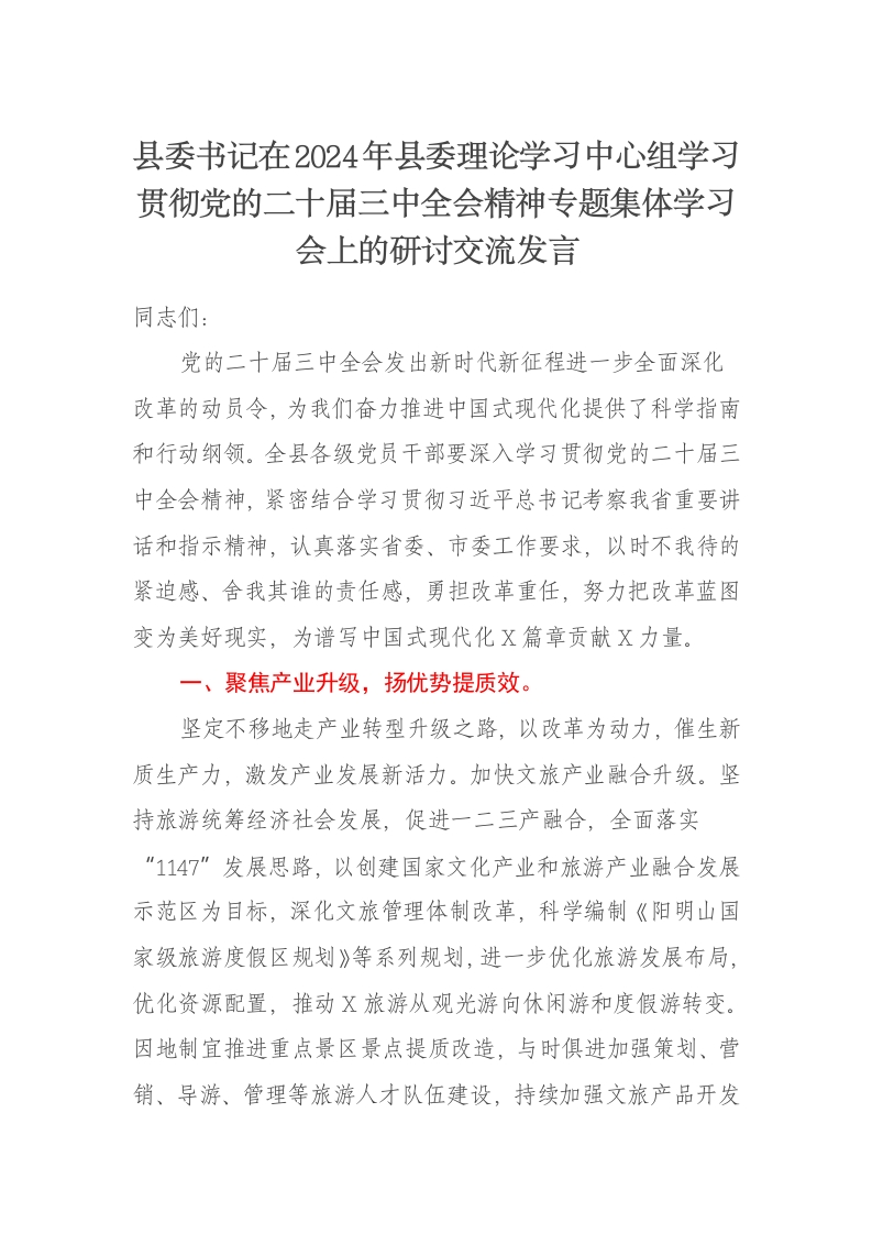 - 县委书记在2024年县委理论学习中心组集体学习会上的研讨交流发言学习贯彻X的二十届三中全会精神专题
