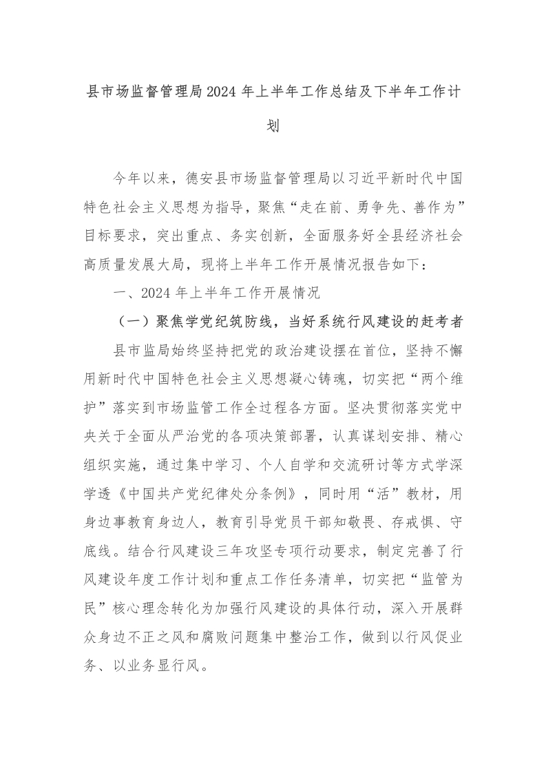 - 县市场监督管理局2024年上半年工作总结及下半年工作计划