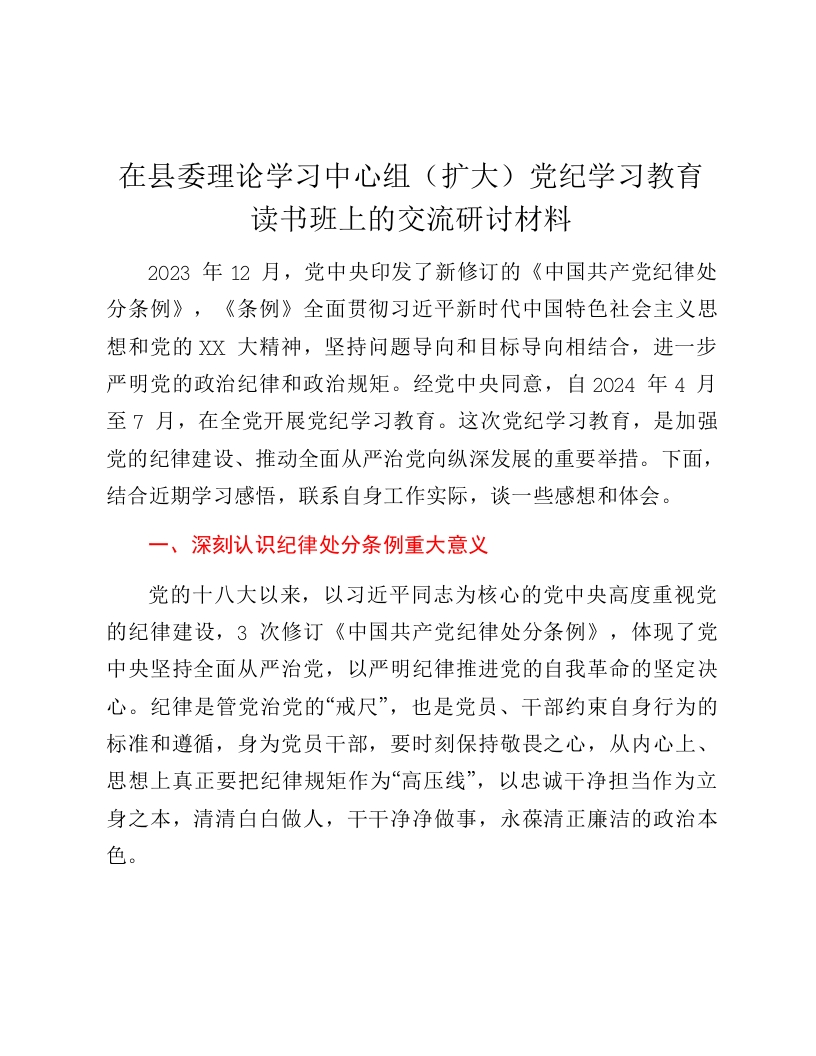 - 在县委理论学习中心组扩大党纪学习教育读书班上的交流研讨材料3 (1)