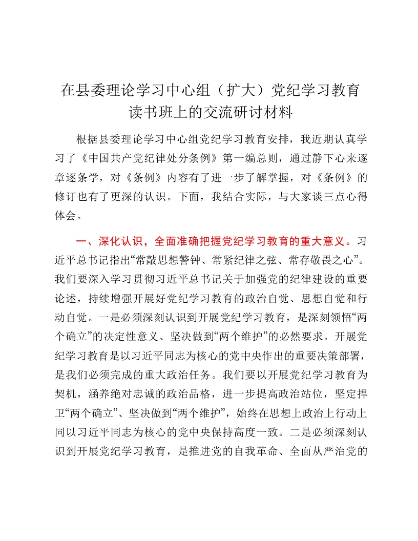 - 在县委理论学习中心组扩大党纪学习教育读书班上的交流研讨材料2 (1)