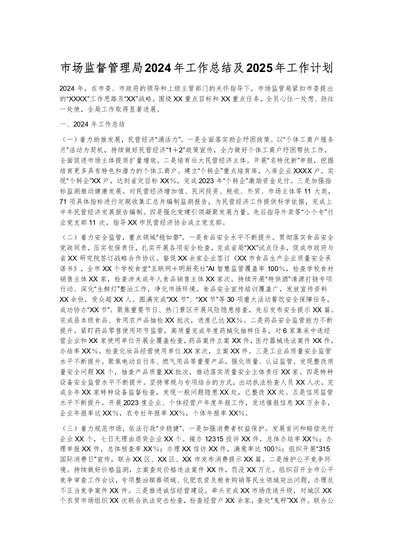 - XX市市场监督管理局2024年工作总结和2025年工作计划