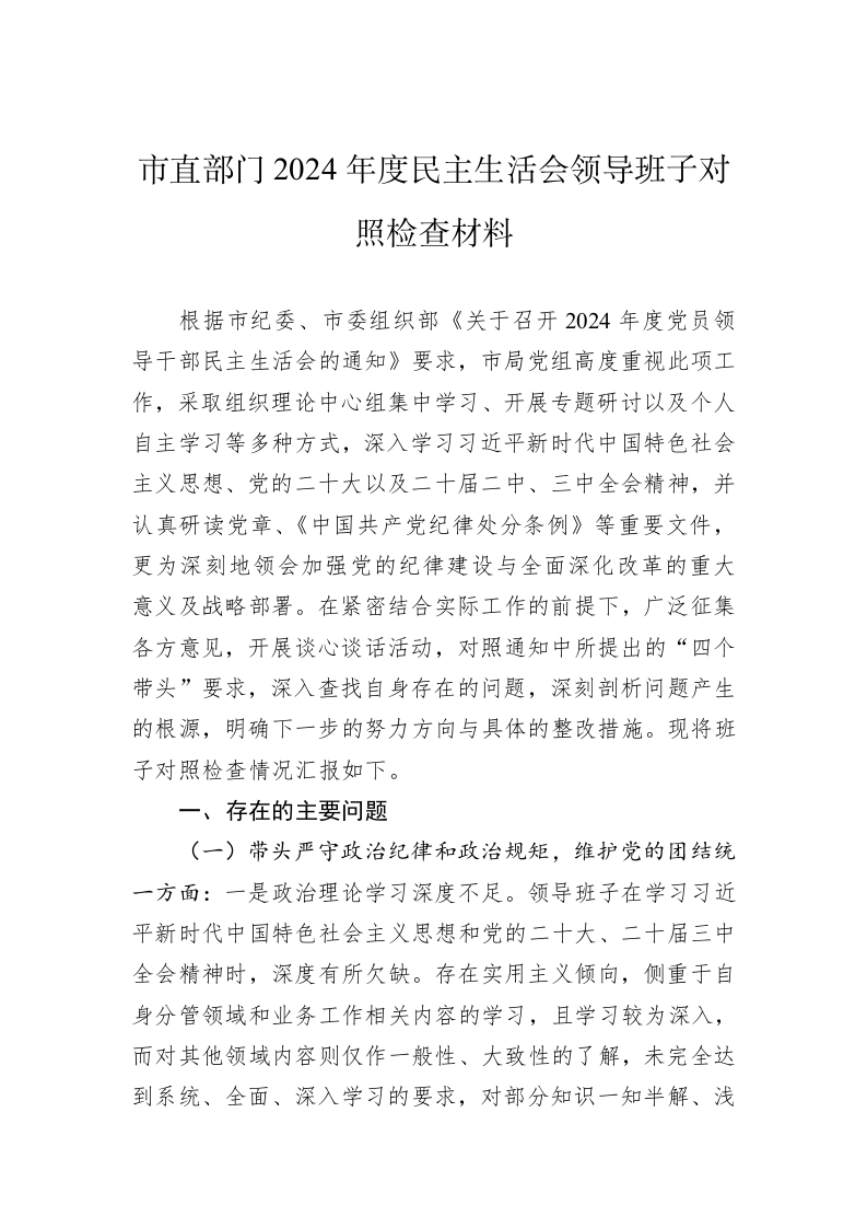 首页工作文档市直部门2024年度民主生活会领导班子对照检查材料