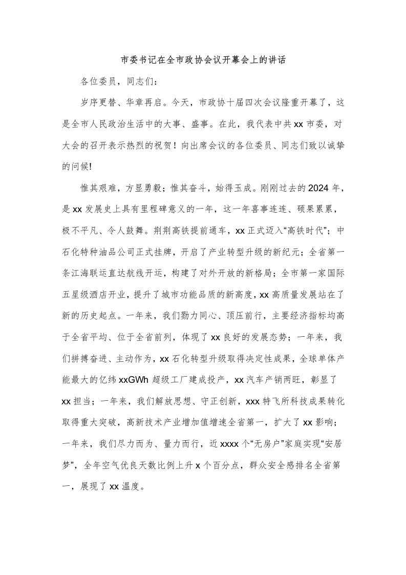 市委书记在全市政协会议开幕会上的讲话