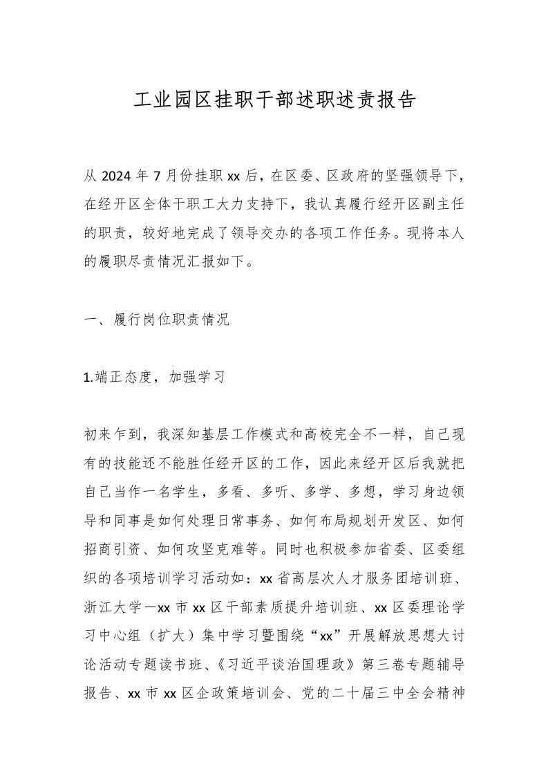 工业园区挂职干部述职述责报告