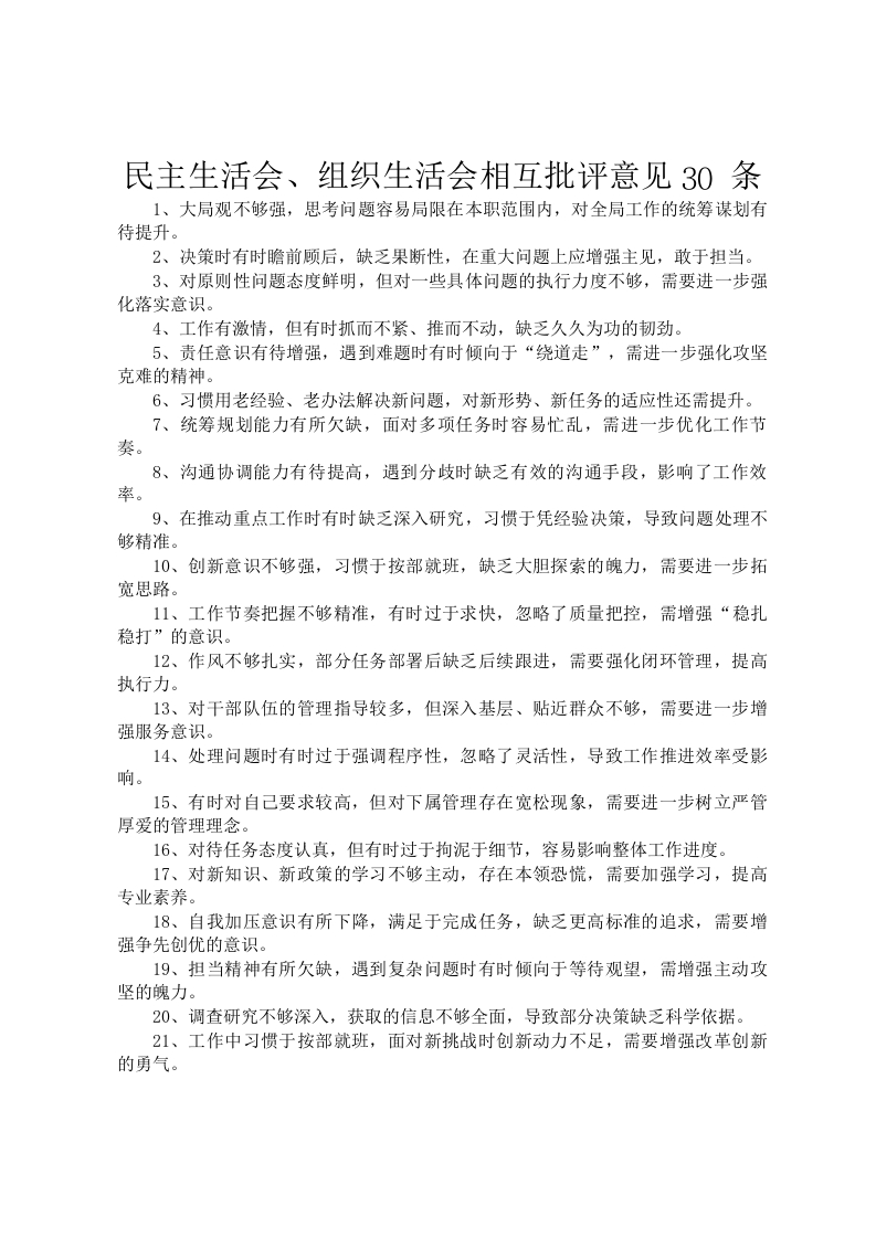 民主生活会、组织生活会相互批评意见30条