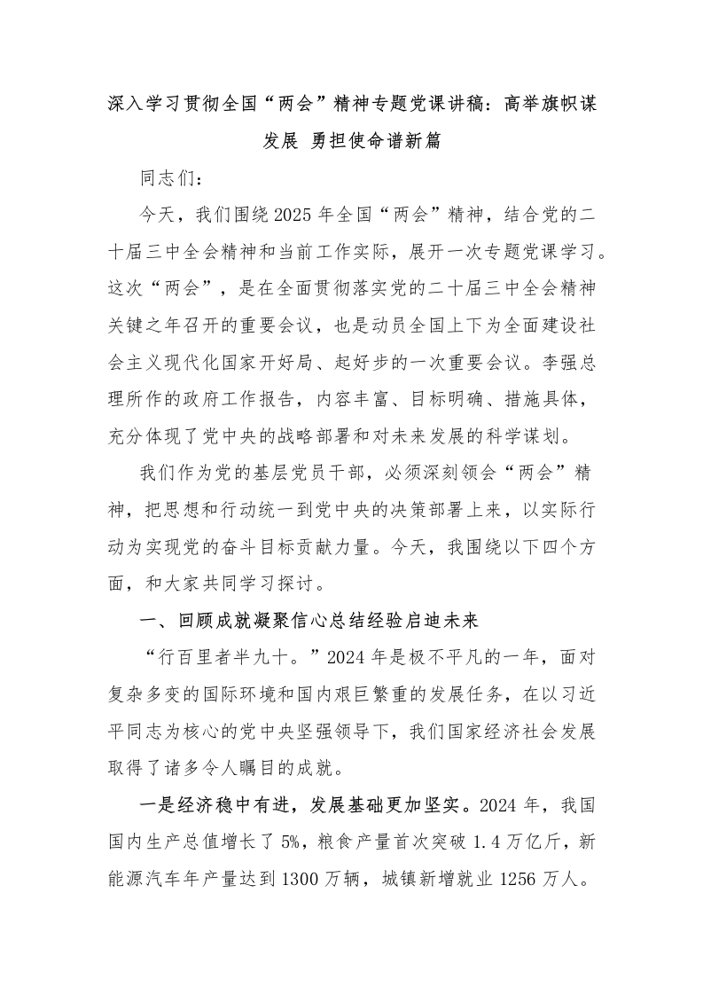 - 深入学习贯彻全国“两会”精神专题党课讲稿:高举旗帜谋发展 勇担使命谱新篇