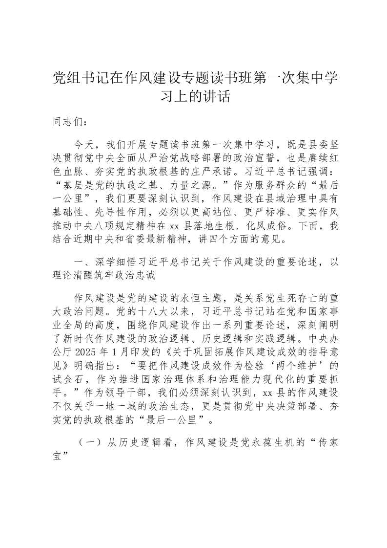 党组书记在作风建设专题读书班第一次集中学习上的讲话