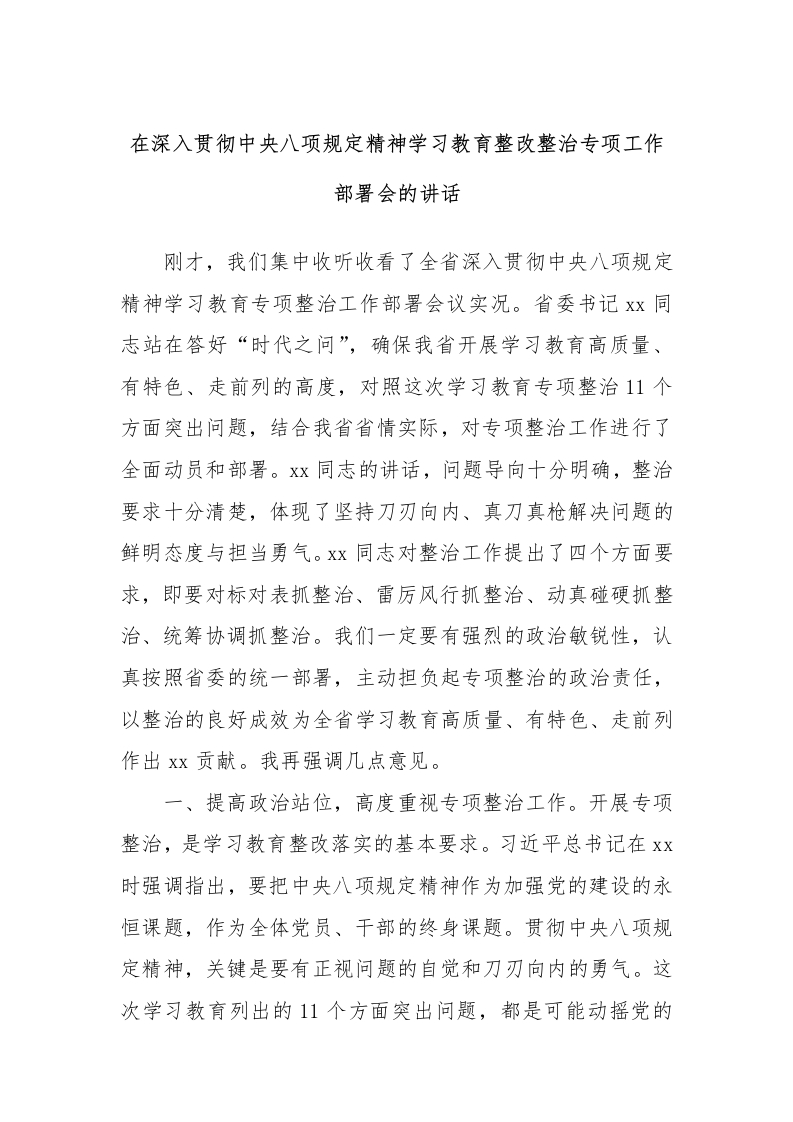在深入贯彻中央八项规定精神学习教育整改整治专项工作部署会的讲话