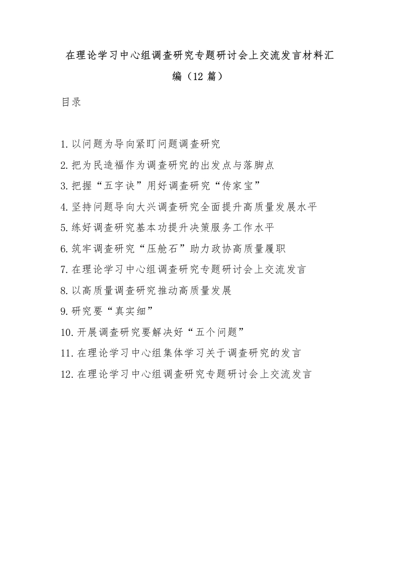 首页精选范文(12篇)在理论学习中心组调查研究专题研讨会上交流发言材料汇编