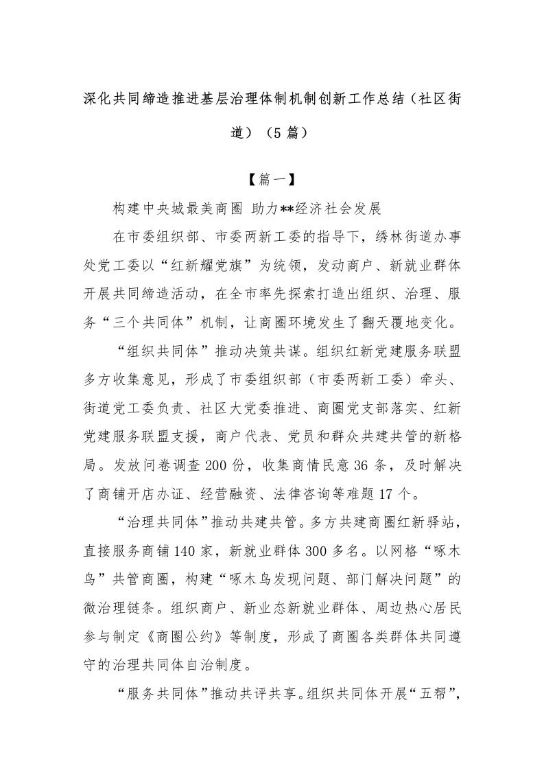 (5篇)深化共同缔造推进基层治理体制机制创新工作总结(社区街道)