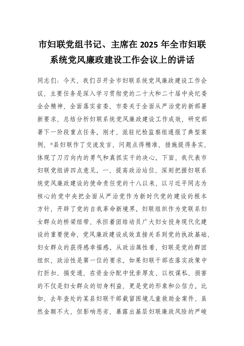 - 在2025年全市妇联系统党风廉政建设工作会议上的讲话