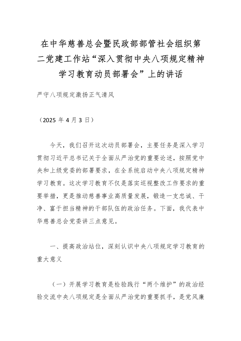 - 在慈善总会暨民政部部管社会组织党建工作站“深入贯彻中央八项规定精神学习教育动员部署会”上的讲话