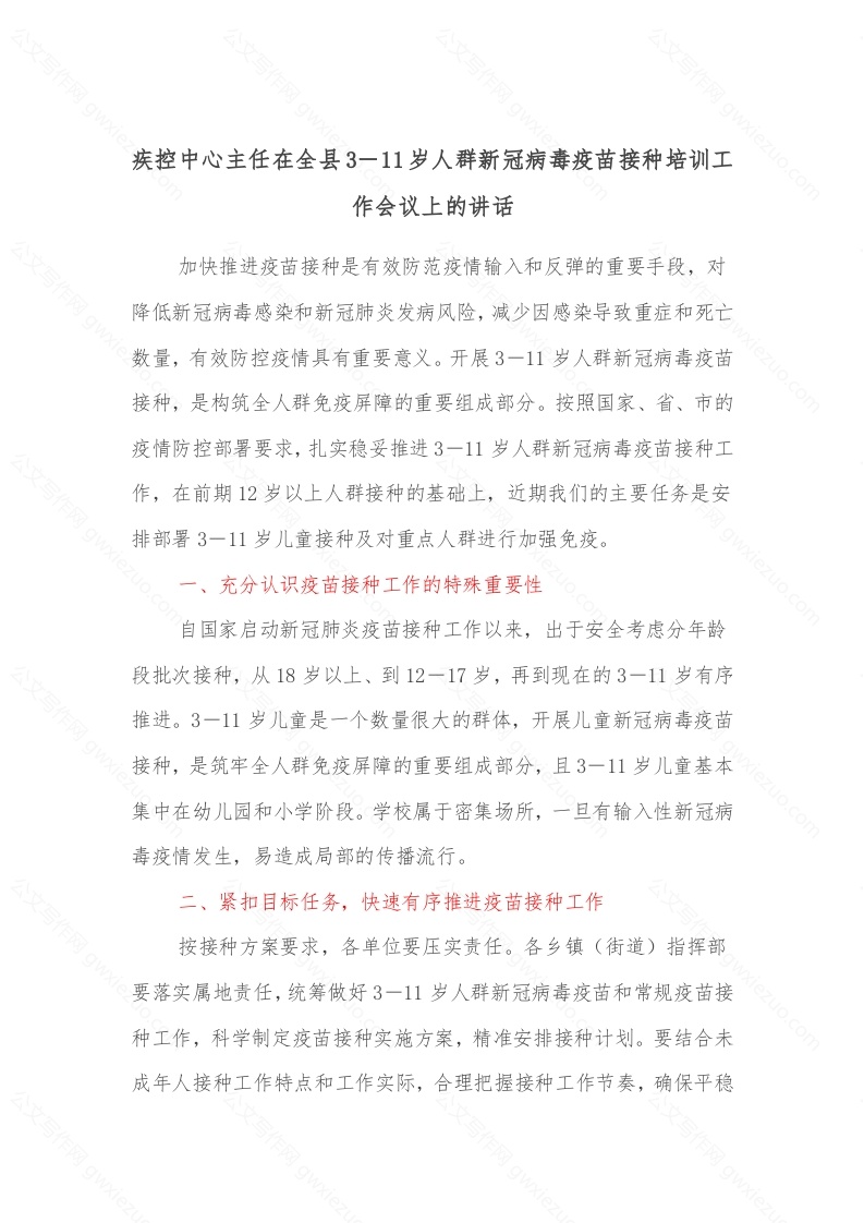 疾控中心主任在全县3-11岁人群新冠病毒疫苗接种培训工作会议上的讲话
