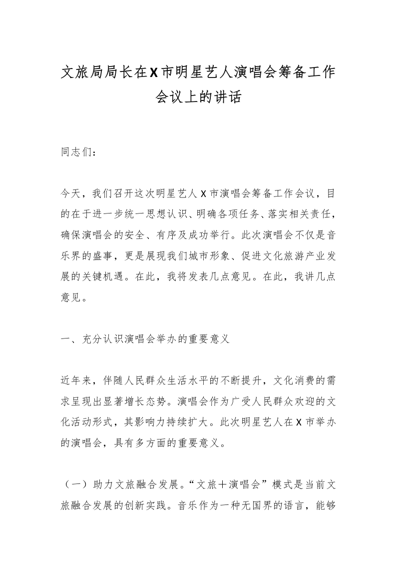 文旅局局长在X市明星艺人演唱会筹备工作会议上的讲话