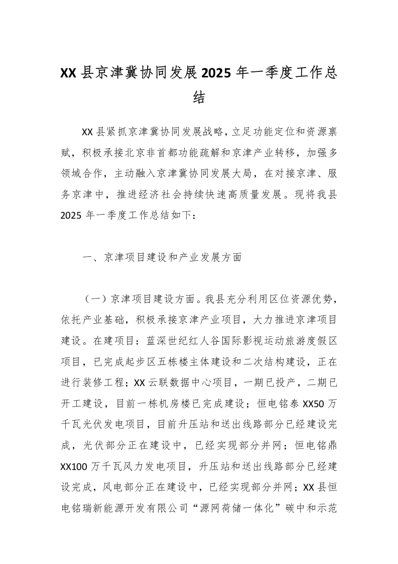首页精选范文XX县京津冀协同发展2025年一季度工作总结