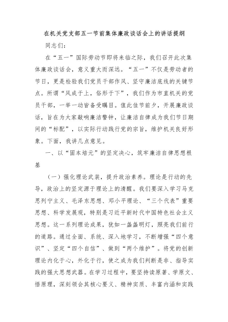 在机关党支部五一节前集体廉政谈话会上的讲话提纲