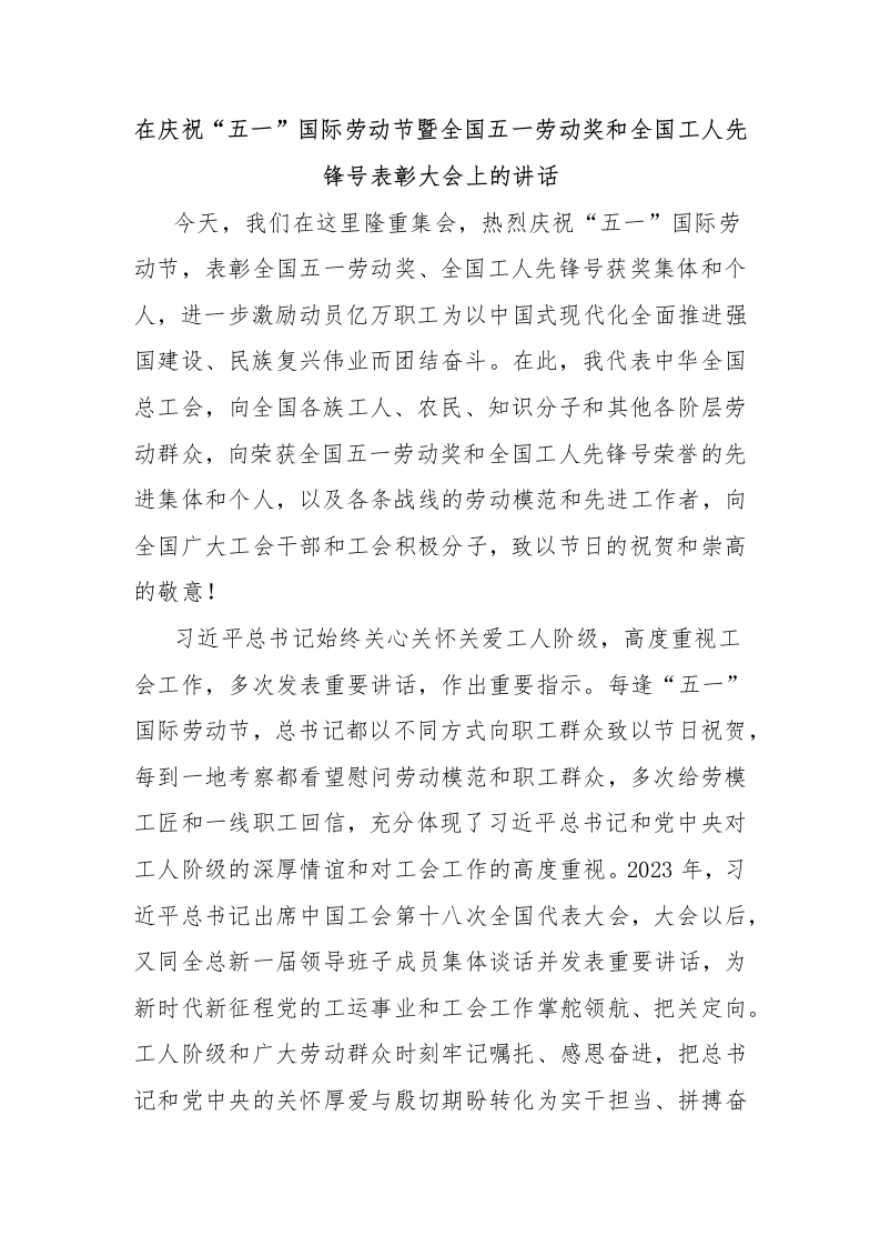在庆祝“五一”国际劳动节暨全国五一劳动奖和全国工人先锋号表彰大会上的讲话