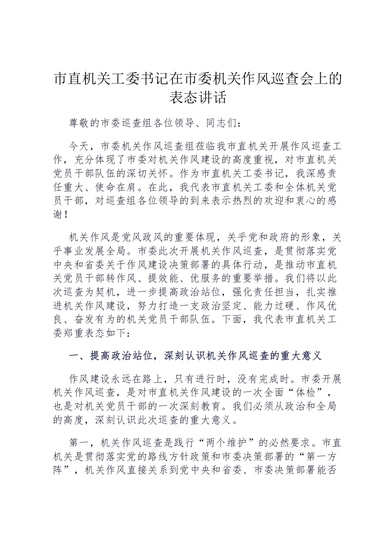 首页写作素材市直机关工委书记在市委机关作风巡查会上的表态讲话