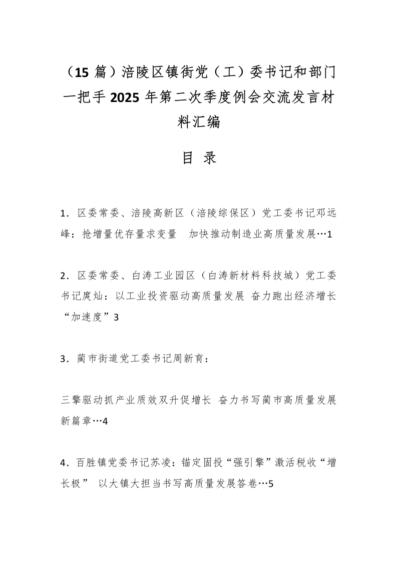 首页讲课讲稿15篇涪陵区镇街党工委书记和部门一把手2025年第二次季度例会交流发言材料汇编