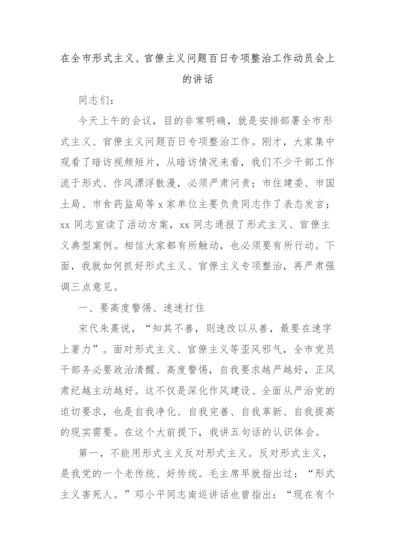 在全市形式主义、官僚主义问题百日专项整治工作动员会上的讲话
