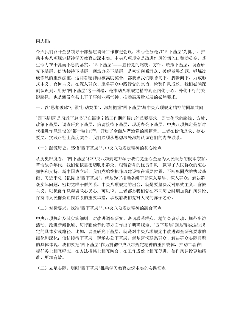 - 县委书记在全县领导干部基层调研工作推进会议上的讲话:以“四下基层”实效推动深入贯彻中央八项规定精神学习教育走深走实