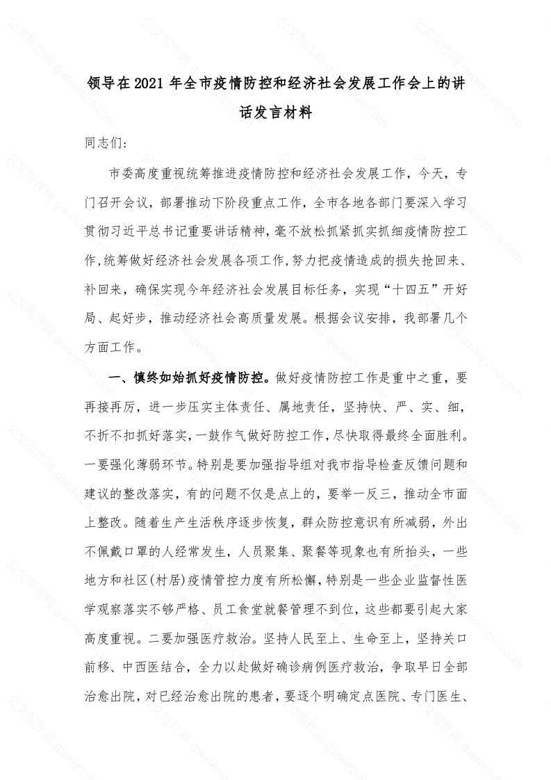 首页精选范文领导在2021年全市疫情防控和经济社会发展工作会上的讲话发言材料