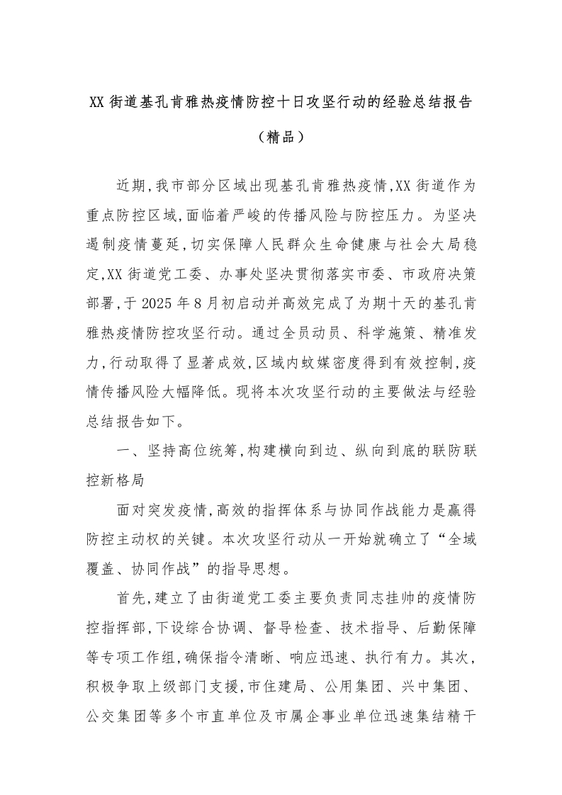 XX街道基孔肯雅热疫情防控十日攻坚行动的经验总结报告(精品)