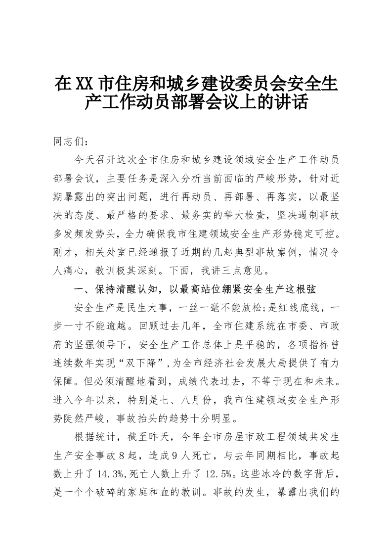 在XX市住房和城乡建设委员会安全生产工作动员部署会议上的讲话