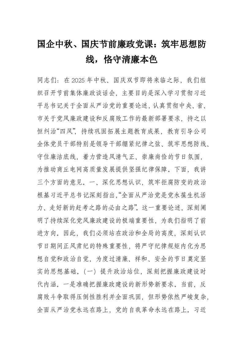 - 国企中秋、国庆节前廉政党课:筑牢思想防线,恪守清廉本色