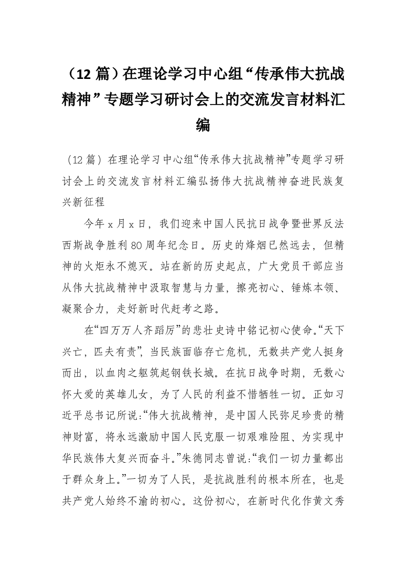 - (10篇)在理论学习中心组“传承伟大抗战精神”专题学习研讨会上的交流发言材料汇编